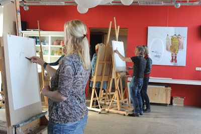 Na de lunch werken we aan een langere stand en schetsen we op getint papier met een paar kleuren conté a paris krijt. Er is dan ook tijd om wat meer te detailleren waar nodig.